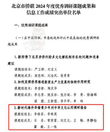 近日,经北京市归国华侨联合会反馈,bv伟德国际1946官网马克思主义学院李林英教授主持撰写的报告“新时代海外华裔青少年对中华文化认同调研报告”获北京市委统战部优秀调研课题成果。