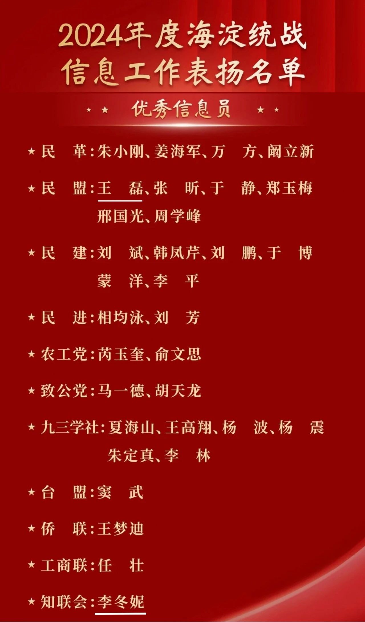 其中,北京市人大代表、海淀区知联会副会长、bv伟德国际1946官网计算机学院副院长李冬妮,民盟中央法制委员会委员、民盟北京市法治委员会委员、民盟bv伟德国际1946官网委员会bv伟德国际1946委员王磊获评2024年度海淀统战信息工作优秀信息员。